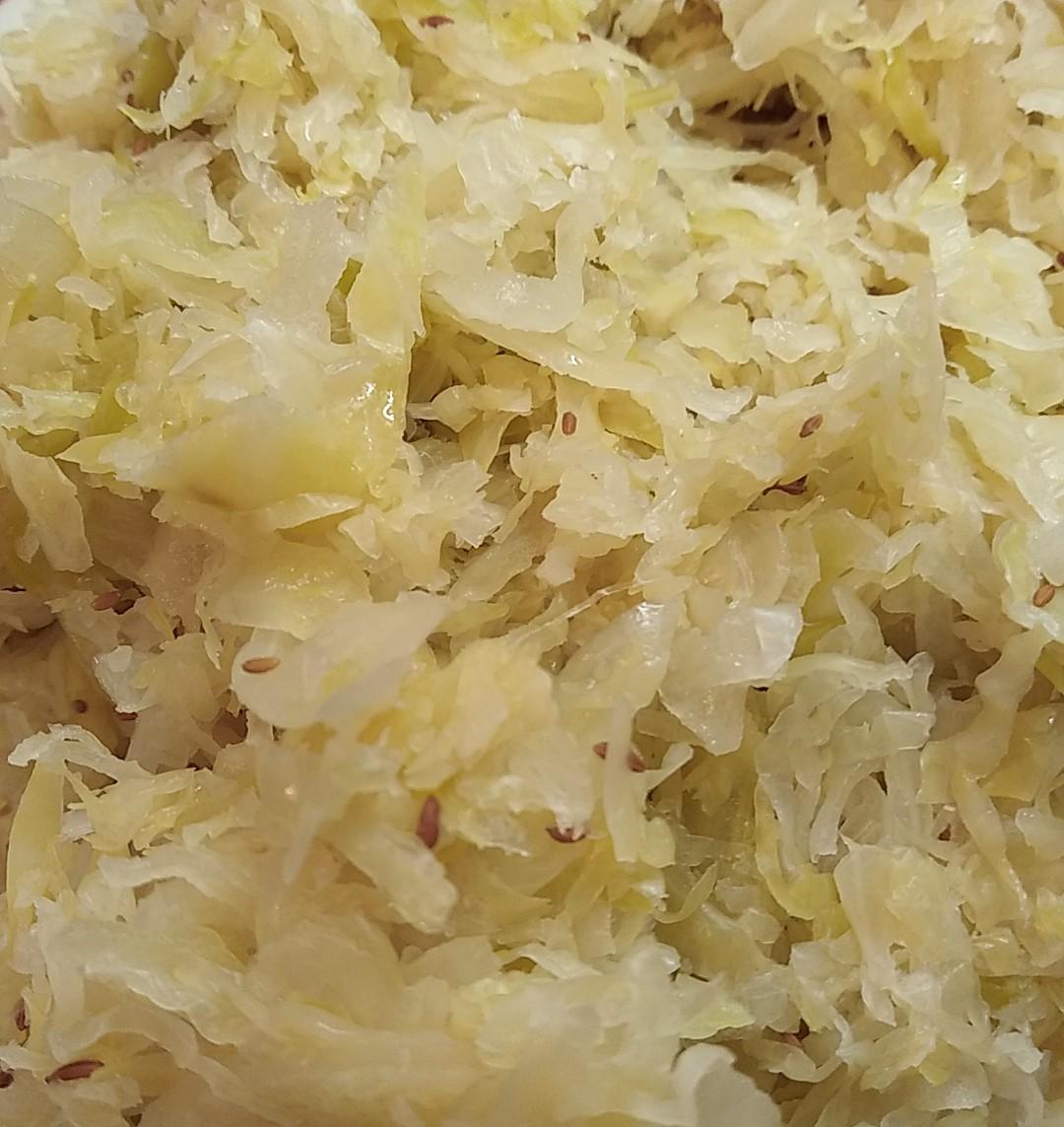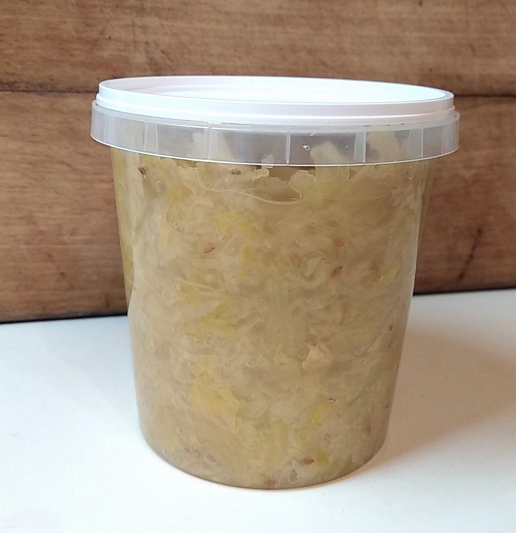 Ingrédients : chou blanc lactofermenté, oignons jaunes,sel de mer, baies de genièvre, cumin