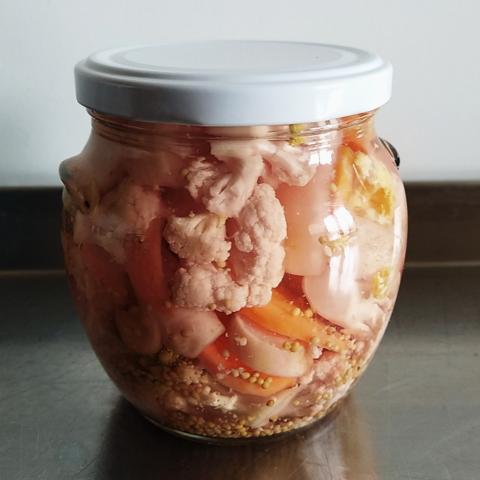 Ingrédients: choux fleurs blancs et jaunes, chou romanesco, carottes,oignons, eau, vinaigre blanc, sucre, sel, graines de moutardes, poivre noir, clous de girofle, piment de Jamaique