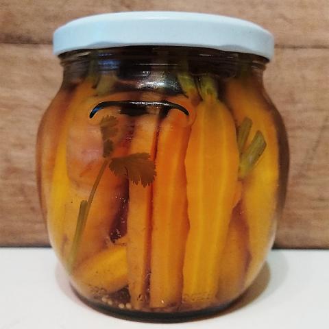 Ingrédients: oignons, carottes, choux-fleurs, poivrons, eau, vinaigre blanc, sucre, sel, graines de moutardes, poivre noir, clous de girofle, piment de Jamaique