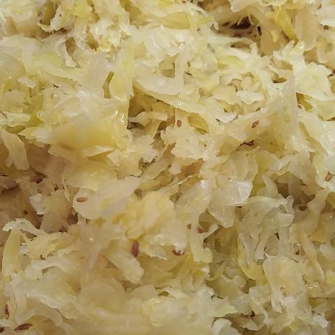 Ingrédients : chou blanc lactofermenté, oignons jaunes,sel de mer, baies de genièvre, cumin